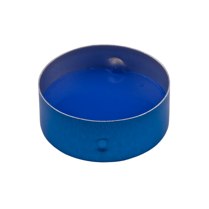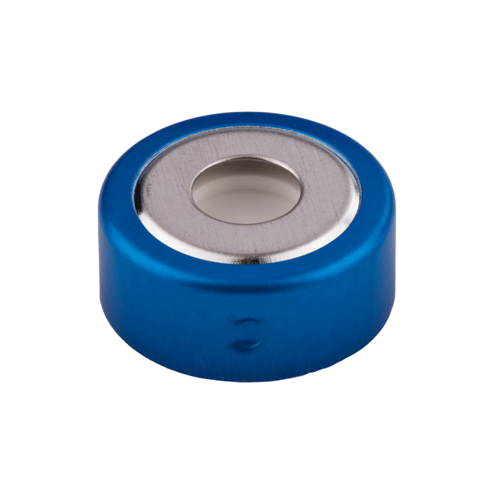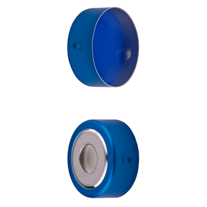 Caps, Headspace, Crimp Top, with White Silicone Rubber / Blue PTFE SPME Style Septa, fitted in Bimetallic, Magnetic, Blue Caps with 8mm center holes. For use with 20mm Crimp Top Headspace Vials. BASIK Brand. 100/PK.