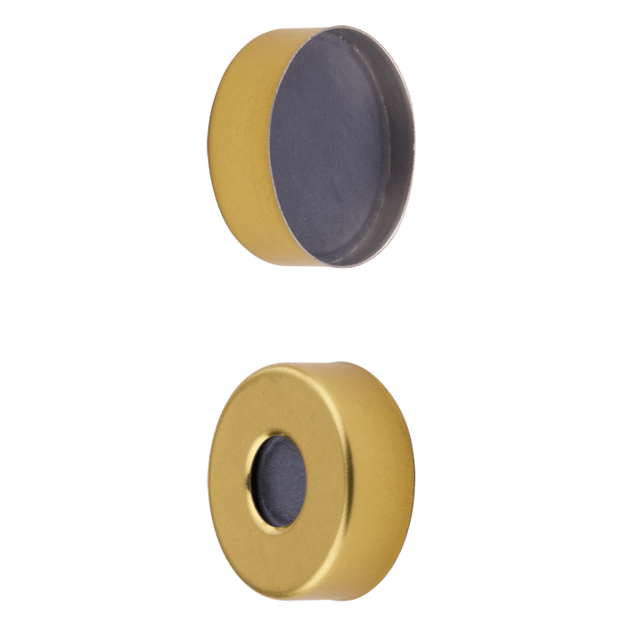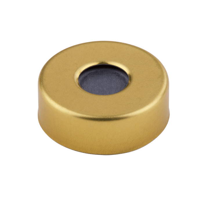 Caps, Headspace, Crimp Top, with Grey Butyl Rubber / Transparent PTFE Septa, fitted in Steel, Magnetic, Gold Caps with 8mm center holes. For use with 20mm Crimp Top Headspace Vials. BASIK Brand. 1000/CS.