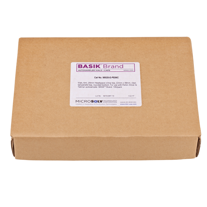 Vials, Headspace, Crimp Top, Glass. Clear. 6ml, 20mm Serum Finish, 22x38mm outer dimensions, Beveled Top and Rounded Bottom with a Tapered Neck. Perkin Elmer Compatible. BASIK Brand. 100/PK.