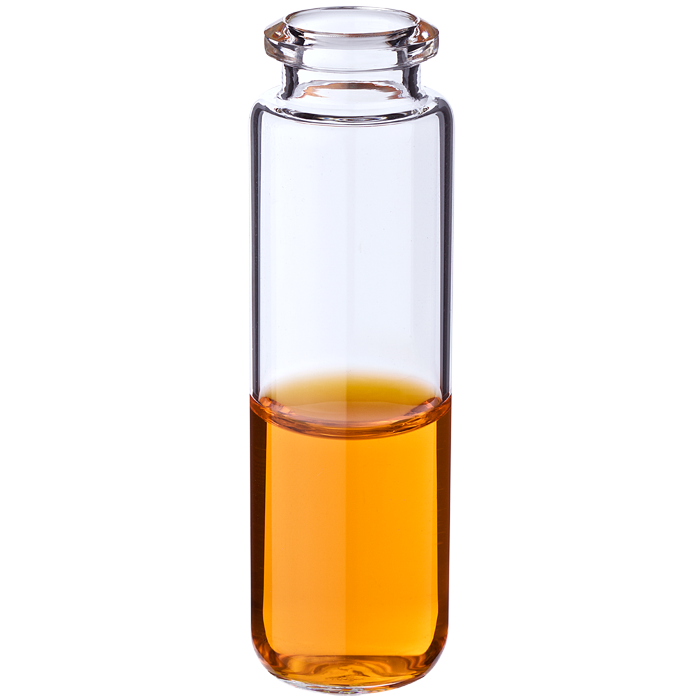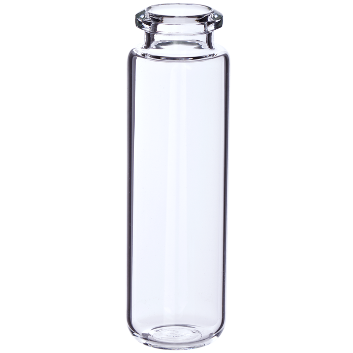 Vials, Headspace, Crimp Top, Glass. Clear. 20ml, 20mm Serum Finish, 23x75.5mm outer dimensions, Beveled Top and Rounded Bottom with a Tapered Neck. Perkin Elmer Compatible. MicroSolv Brand. 100/PK.