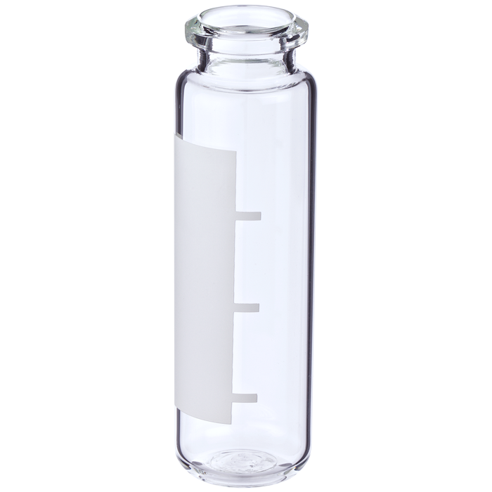 Vials, Headspace, Crimp Top, Glass. Clear with Write-On Patch and fill lines. 20ml, 20mm Serum Finish, 23x75.5mm outer dimensions, Beveled Top and Rounded Bottom with a Tapered Neck. Perkin Elmer Compatible. MicroSolv Brand. 100/PK.