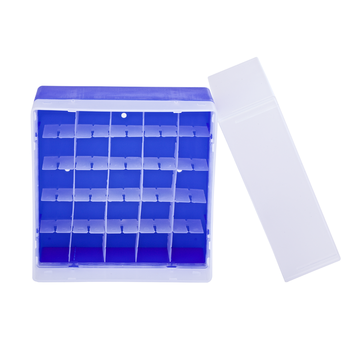 These stackable, Storage Boxes are often used for 20mm Headspace Vials for storage or transportation. The Alphanumeric Coding on the boxes makes it easier for Sample Identification. The "egg crate" separators make it easy to keep vials apart.