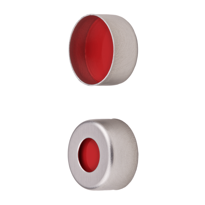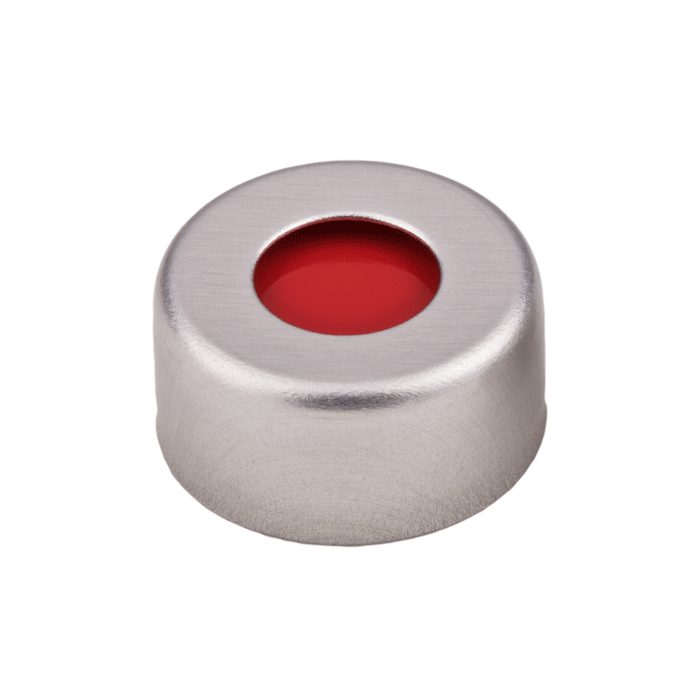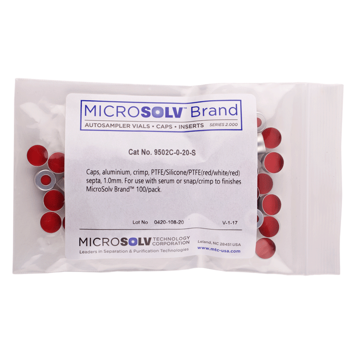 Caps, Crimp Top, with 1.0mm thick, Red PTFE / White Silicone Rubber / Red PTFE Septa, fitted in aluminum, Silver Caps. For use with 11mm Crimp or Snap Top, 12x32mm autosampler vials. MicroSolv Brand. 100/PK.
