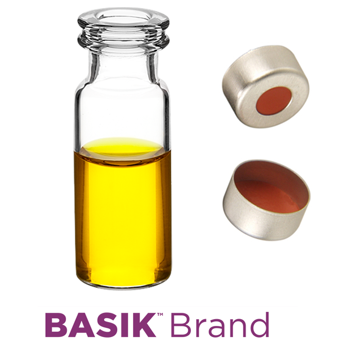 Vial & Cap Kit includes 100 EA 2ml, Snap / Crimp Top, Clear Autosampler Vials and 100 EA matching Crimp Caps with Red Rubber / PTFE Septa, fitted in the Silver Caps. BASIK Brand Easy Purchase Pack. 1/PK.