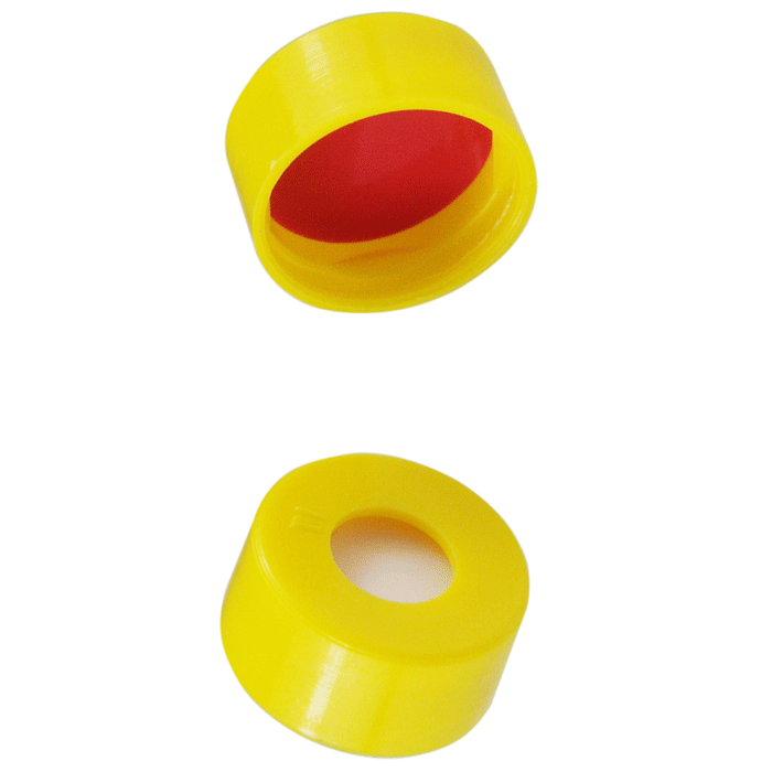 Caps, Snap Top, with Silicone Rubber / PTFE Septa, fitted in smooth, polyethylene, Yellow Caps. For use with 11mm, 12x32mm Snap Top autosampler vials. MicroSolv Brand. 100/PK.