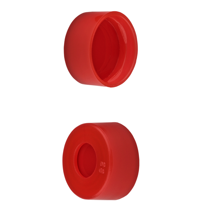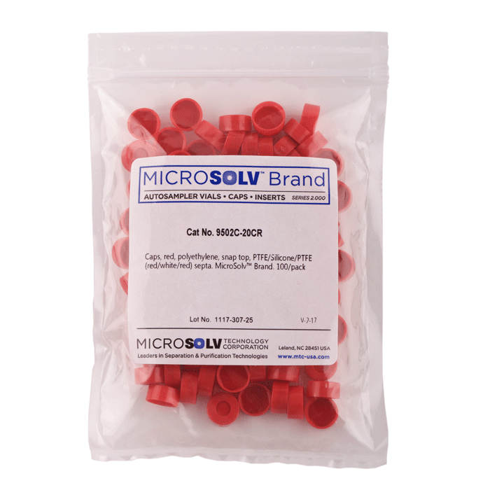Caps, Snap Top, with Red PTFE / White Silicone Rubber / Red PTFE Septa, fitted in smooth, polyethylene, Red Caps. For use with 11mm, 12x32mm Snap Top autosampler vials. MicroSolv Brand. 100/PK.