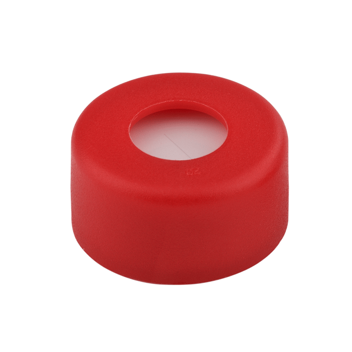 Caps, Snap Top, with Silicone Rubber / PTFE Pre-Slit Septa, fitted in smooth, polyethylene, Red Caps. For use with 11mm, 12x32mm Snap Top autosampler vials. MicroSolv Brand. 100/PK.