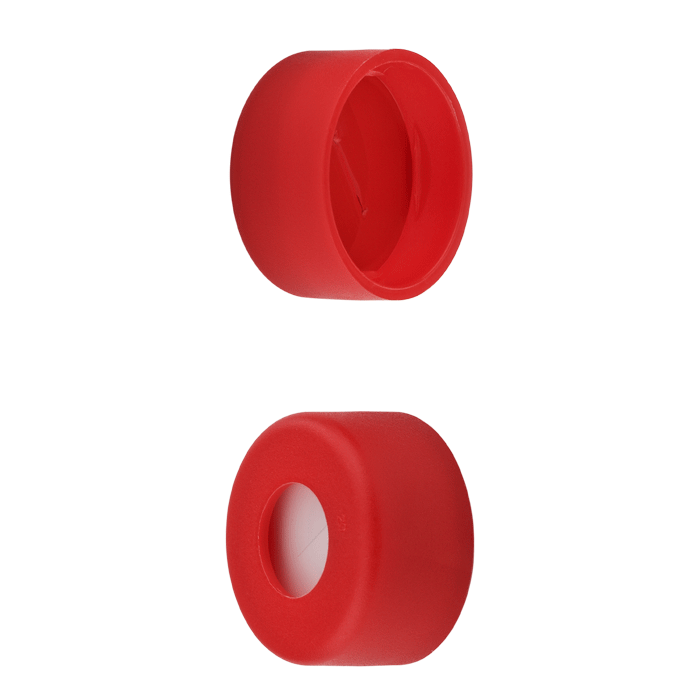 Caps, Snap Top, with Silicone Rubber / PTFE Pre-Slit Septa, fitted in smooth, polyethylene, Red Caps. For use with 11mm, 12x32mm Snap Top autosampler vials. MicroSolv Brand. 1000/CS.