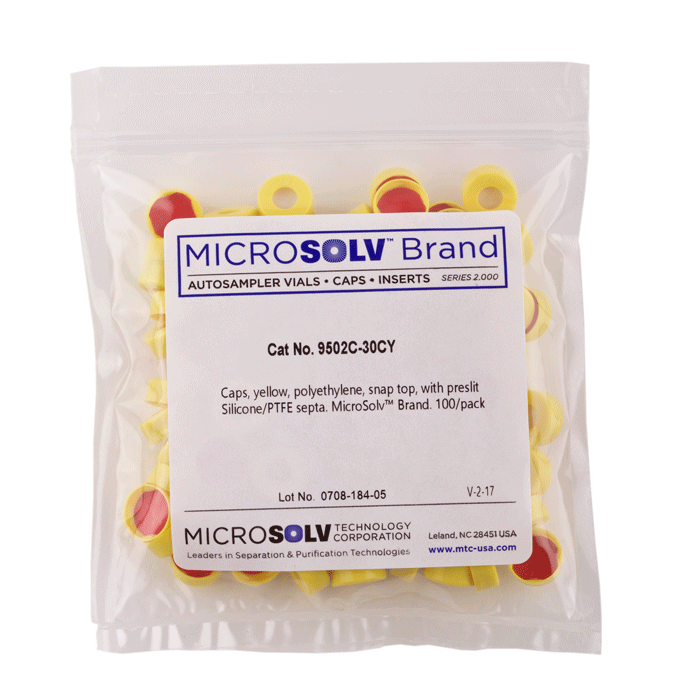 Caps, Snap Top, with Silicone Rubber / PTFE Pre-Slit Septa, fitted in smooth, polyethylene, Yellow Caps. For use with 11mm, 12x32mm Snap Top autosampler vials. MicroSolv Brand. 100/PK.
