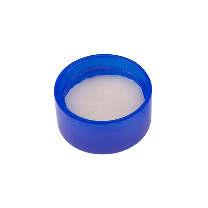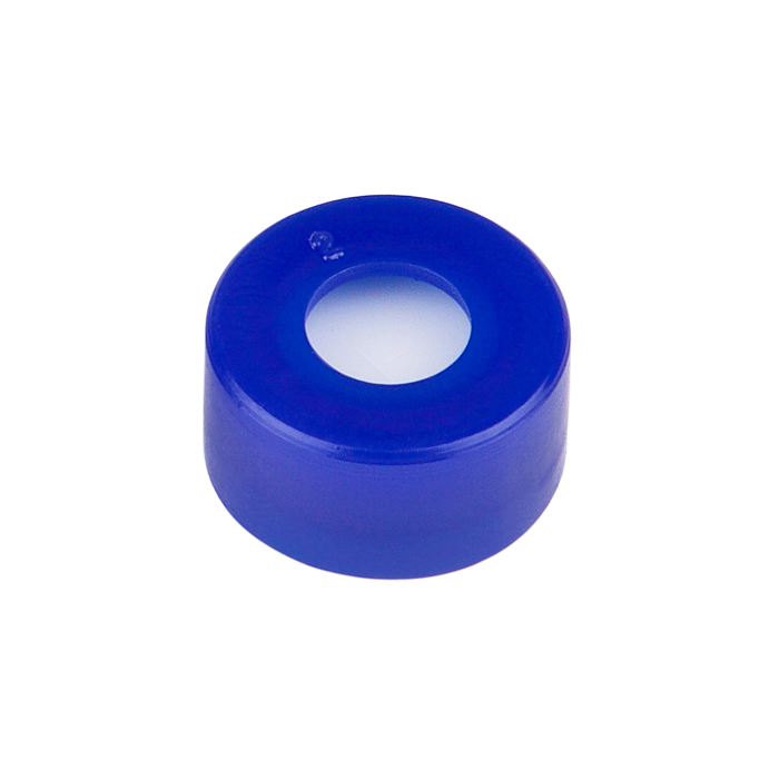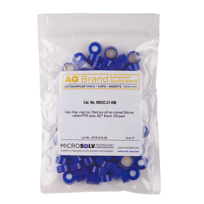 Caps, Snap Top, with White Silicone Rubber / Tan PTFE Pre-Slit Septa, fitted in smooth, polyethylene, Blue Caps. For use with 11mm, 12x32mm Snap Top autosampler vials. AQ Brand. 100/PK.