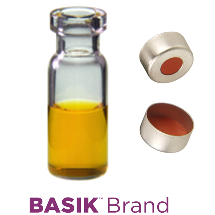 Vial & Cap Kit includes 100 EA 2ml, Crimp Top, Clear Autosampler Vials and 100 EA matching Crimp Caps with Red Rubber / PTFE Septa, fitted in the Silver Caps. BASIK Brand Easy Purchase Pack. 1/PK