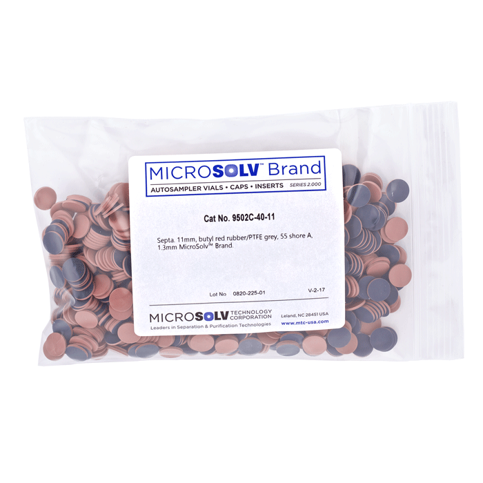 Septa, 11mm, for Crimp Caps, Red Butyl Rubber / Grey PTFE. 1.3mm thick. Use with 11mm Caps. MicroSolv Brand. 1000/CS.