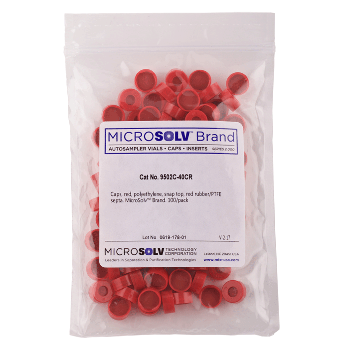 Caps, Snap Top, with Red Rubber / PTFE Septa, fitted in smooth, polyethylene, Red Caps. For use with 11mm, 12x32mm Snap Top autosampler vials. MicroSolv Brand. 100/PK.