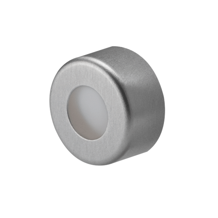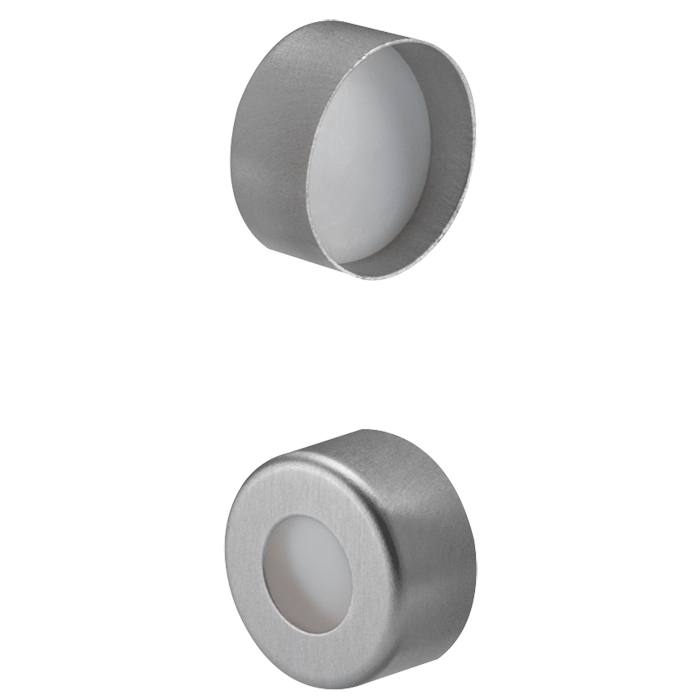Caps, Crimp Top, with PTFE Septa, fitted in aluminum, Silver Caps. For use with 11mm Crimp or Snap Top, 12x32mm autosampler vials. BASIK Brand. 100/PK.