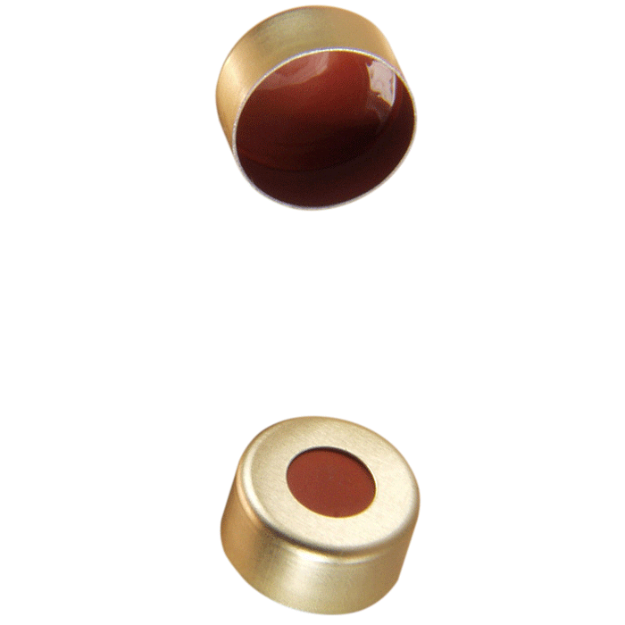 Caps, Crimp Top, with Red Rubber / PTFE Septa, fitted in aluminum, Gold Caps. For use with 11mm Crimp or Snap Top, 12x32mm autosampler vials. BASIK Brand. 100/PK.