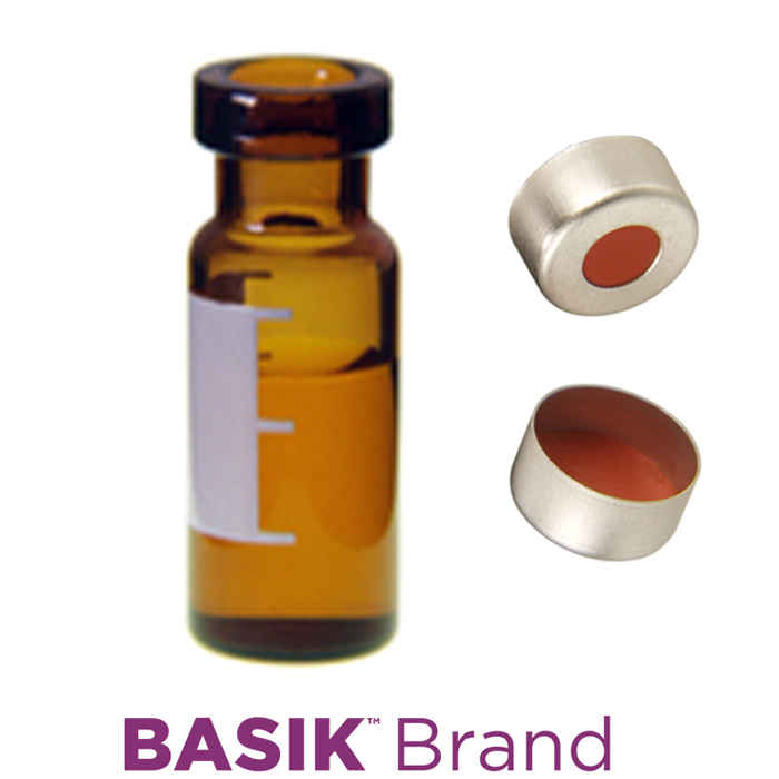 Vial & Cap Kit includes 100 EA 2ml, Crimp Top, Amber Autosampler Vials with Write-On Patch and fill lines and 100 EA matching Crimp Caps with Red Rubber / PTFE Septa, fitted in the Silver Caps. BASIK Brand Easy Purchase Pack. 1/PK