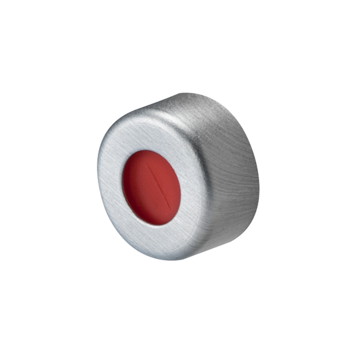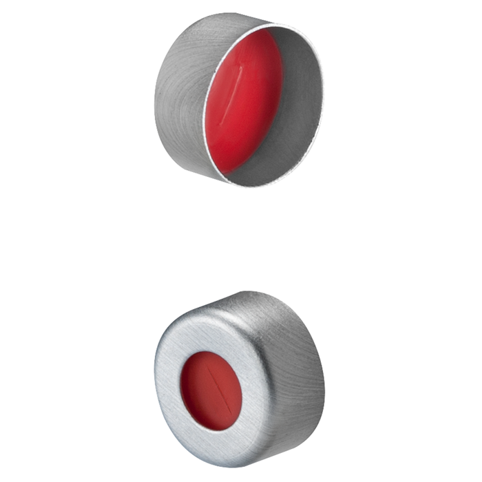 Caps, Crimp Top, with Red Rubber / PTFE Pre-Slit Septa, fitted in aluminum, Sliver Caps. For use with 11mm Crimp or Snap Top, 12x32mm autosampler vials. BASIK Brand. 100/PK.