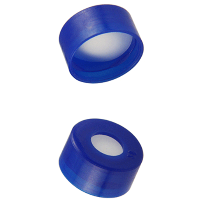 Caps, Snap Top, with White PTFE Septa, fitted in smooth, polyethylene, Blue Caps. For use with 11mm, 12x32mm Snap Top autosampler vials. MicroSolv Brand. 1000/CS.