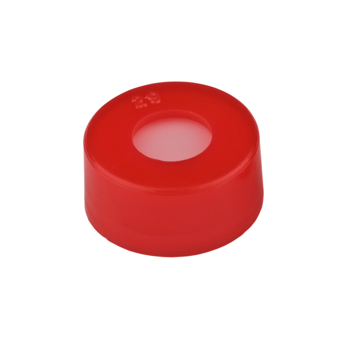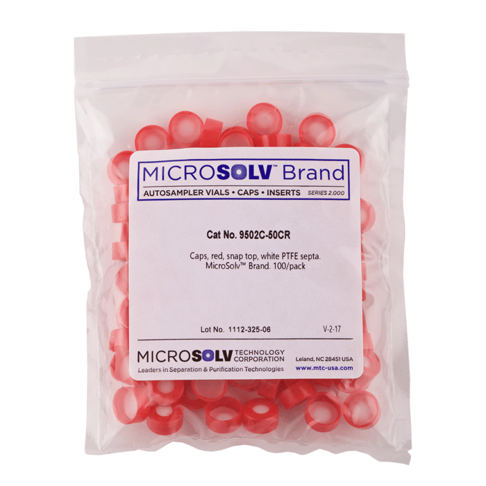 Caps, Snap Top, with White PTFE Septa, fitted in smooth, polyethylene, Red Caps. For use with 11mm, 12x32mm Snap Top autosampler vials. MicroSolv Brand. 100/PK.