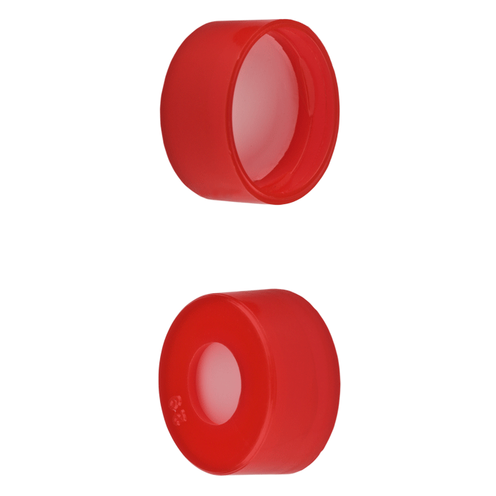 Caps, Snap Top, with White PTFE Septa, fitted in smooth, polyethylene, Red Caps. For use with 11mm, 12x32mm Snap Top autosampler vials. MicroSolv Brand. 1000/CS.