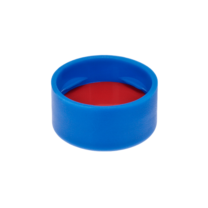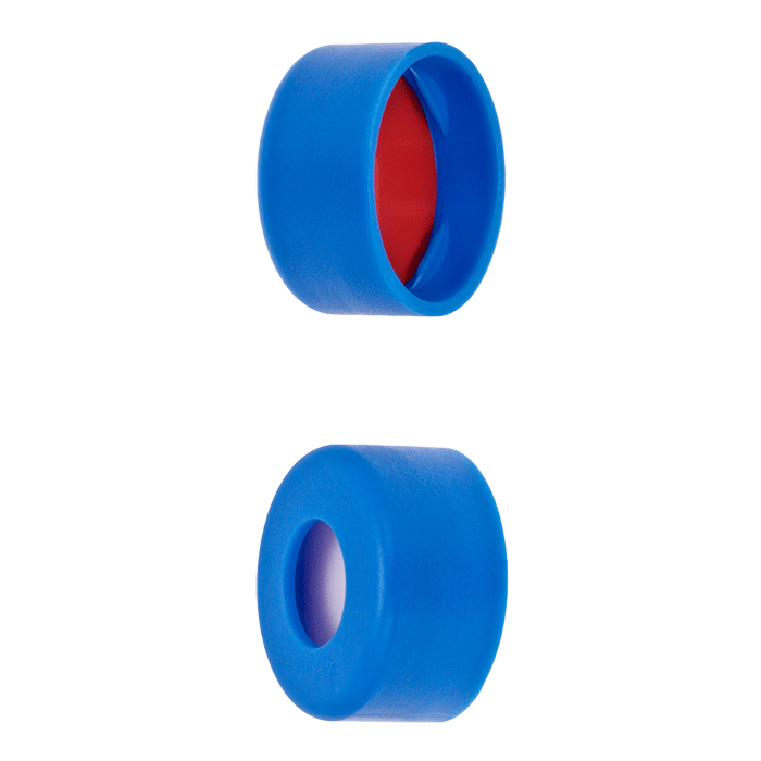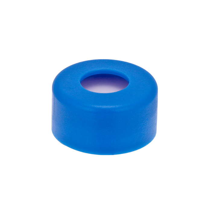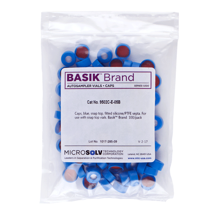Caps, Snap Top, with Silicone Rubber / PTFE Septa, fitted in smooth, polyethylene, Light Blue Caps. For use with 11mm, 12x32mm Snap Top autosampler vials. BASIK Brand. 100/PK.