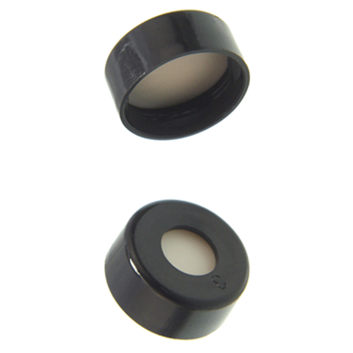 Caps, Snap Top, with 0.04" thick, White Silicone Rubber / Natural PTFE Septa, fitted in smooth, polyethylene, Black Caps. For use with 11mm, 12x32mm Snap Top autosampler vials. BASIK Brand. 1000/CS.