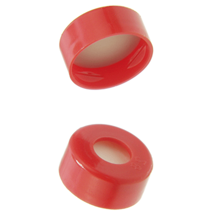 Caps, Snap Top, with 0.04" thick, White Silicone Rubber / Natural PTFE Septa, fitted in smooth, polyethylene, Red Caps. For use with 11mm, 12x32mm Snap Top autosampler vials. BASIK Brand. 1000/CS.