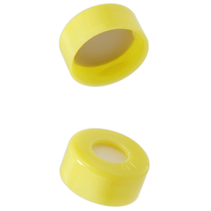 Caps, Snap Top, with 0.04" thick, White Silicone Rubber / Natural PTFE Septa, fitted in smooth, polyethylene, Yellow Caps. For use with 11mm, 12x32mm Snap Top autosampler vials. BASIK Brand. 1000/CS.