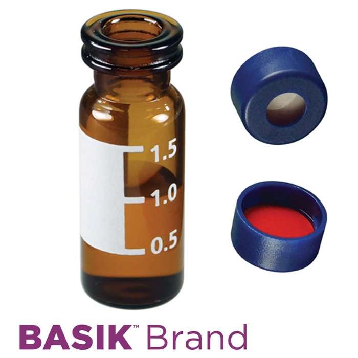 Vial & Cap Kit includes 100 EA 2ml, Snap Top, Amber Autosampler Vials with Write-On Patch and fill lines and 100 EA matching Snap Caps with White Silicone Rubber / Red PTFE Soft-Guard Septa, bonded in the Blue Caps. BASIK Brand Easy Purchase Pack. 1/PK.