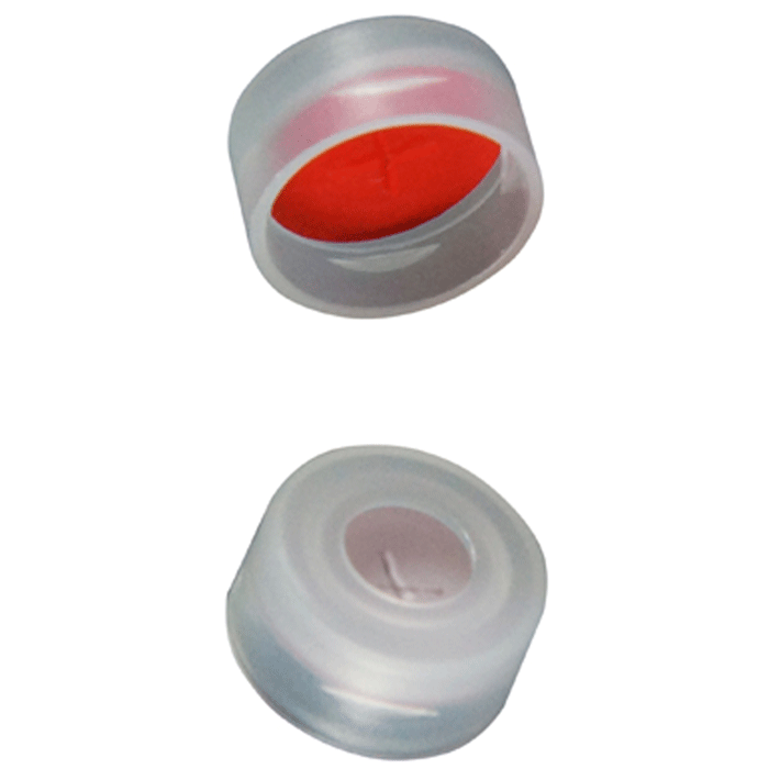 Caps, Snap Top, with Soft-Guard, White Silicone Rubber / Red PTFE Pre-Slit (X Shape) Septa, fitted in smooth, polyethylene, Natural Transparent Caps. For use with 11mm, 12x32mm Snap Top autosampler vials. Soft-Guard Brand. 100/PK.