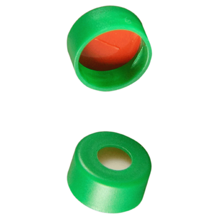 Caps, Snap Top, with Soft-Guard, White Silicone Rubber / Red PTFE Pre-Slit Septa, fitted in smooth, polyethylene, Green Caps. For use with 11mm, 12x32mm Snap Top autosampler vials. Soft-Guard Brand. 100/PK.