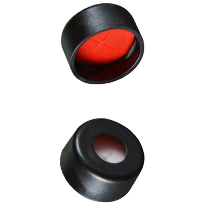 Caps, Snap Top, with Soft-Guard, White Silicone Rubber / Red PTFE Pre-Slit (X Shape) Septa, fitted in smooth, polyethylene, Green Caps. For use with 11mm, 12x32mm Snap Top autosampler vials. Soft-Guard Brand. 100/PK.