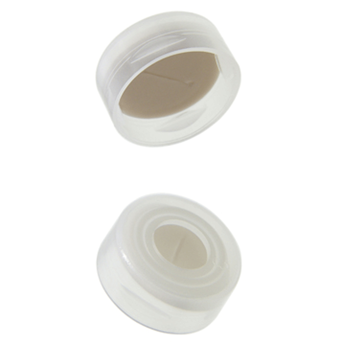 Caps, Snap Top, with 0.04" thick, White Silicone Rubber / Natural PTFE Pre-Slit Septa, fitted in smooth, polyethylene, Natural Transparent Caps. For use with 11mm, 12x32mm Snap Top autosampler vials. BASIK Brand. 1000/CS.