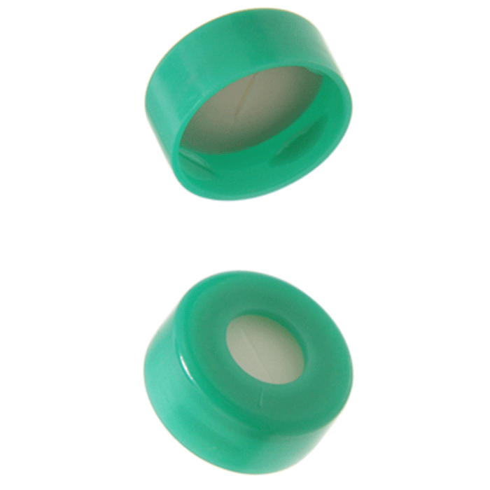 Caps, Snap Top, with 0.04" thick, White Silicone Rubber / Natural PTFE Pre-Slit Septa, fitted in smooth, polyethylene, Green Caps. For use with 11mm, 12x32mm Snap Top autosampler vials. BASIK Brand. 1000/CS.