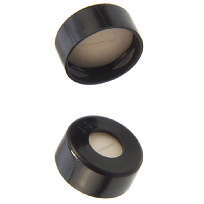 Caps, Snap Top, with 0.04" thick, White Silicone Rubber / Natural PTFE Pre-Slit Septa, fitted in smooth, polyethylene, Black Caps. For use with 11mm, 12x32mm Snap Top autosampler vials. BASIK Brand. 100/PK.