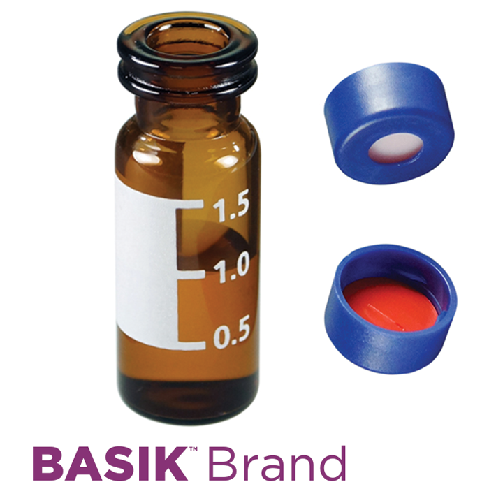 Vial & Cap Kit includes 100 EA 2ml, Snap Top, Amber Autosampler Vials with Write-On Patch and fill lines and 100 EA matching Snap Caps with White Silicone Rubber / Red PTFE Pre-Slit, Soft-Guard Septa, bonded in the Blue Caps. BASIK Brand Easy Purchase Pack. 1/PK.