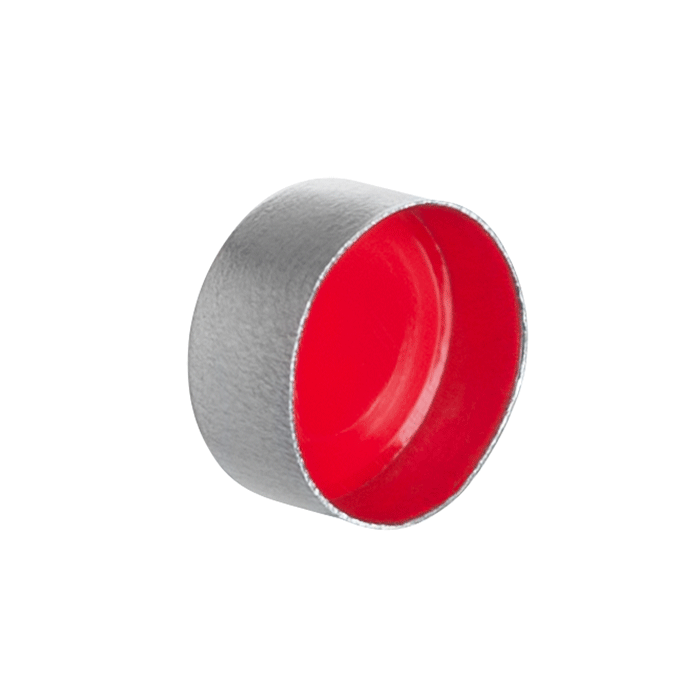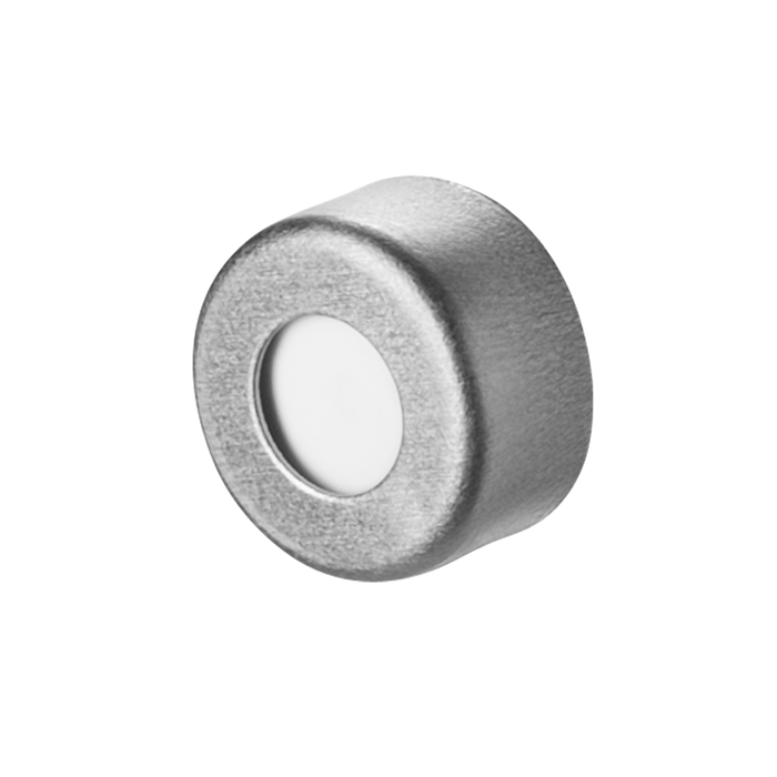 Caps, Crimp Top, with Soft-Guard, White Silicone / Red PTFE Septa, fitted in aluminum, Silver Caps. For use with 11mm Crimp or Snap Top, 12x32mm autosampler vials. Soft-Guard Brand. 100/PK.