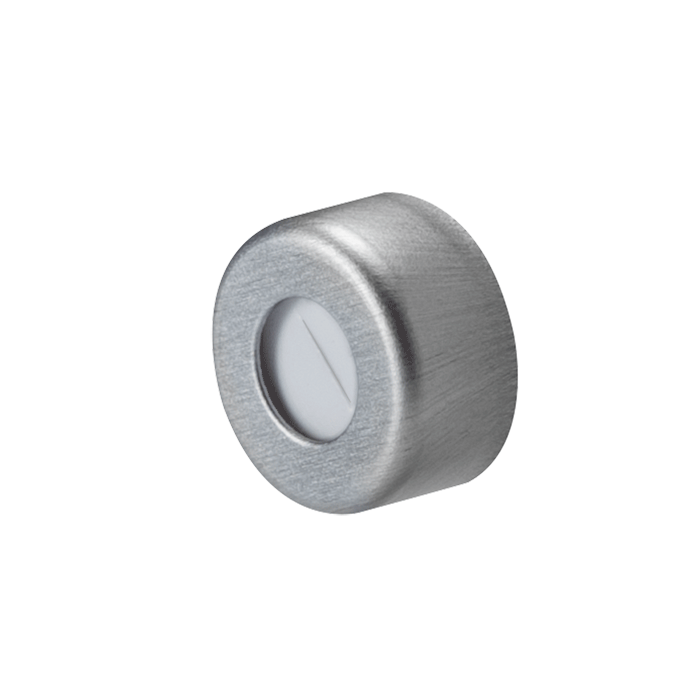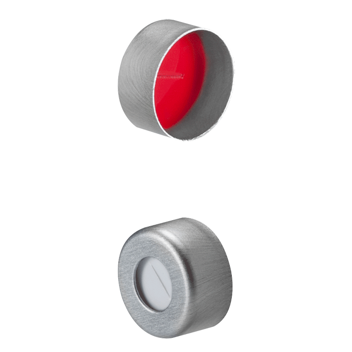 Caps, Crimp Top, with Soft-Guard, White Silicone / Red PTFE Pre-Slit Septa, fitted in aluminum, Silver Caps. For use with 11mm Crimp or Snap Top, 12x32mm autosampler vials. Soft-Guard Brand. 100/PK.
