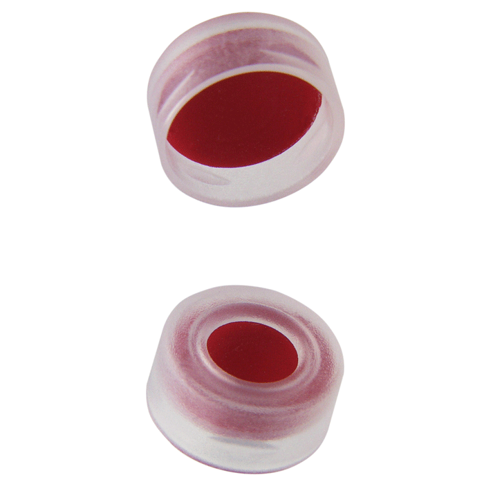 Caps, Snap Top, with 1.00mm thick, Red PTFE / White Silicone Rubber / Red PTFE Septa, fitted in smooth, soft polyethylene, Natural Translucent Caps. For use with 11mm, 12x32mm Snap Top autosampler vials. MicroSolv Brand. 100/PK.