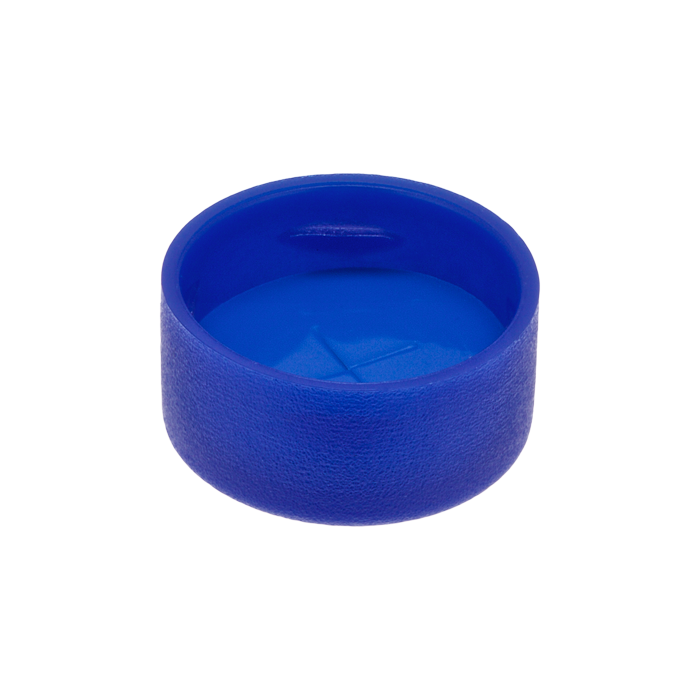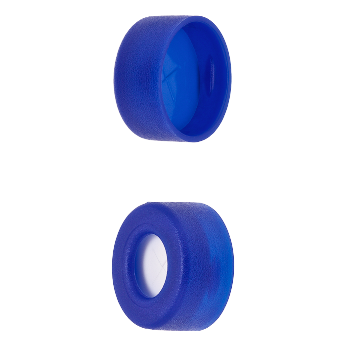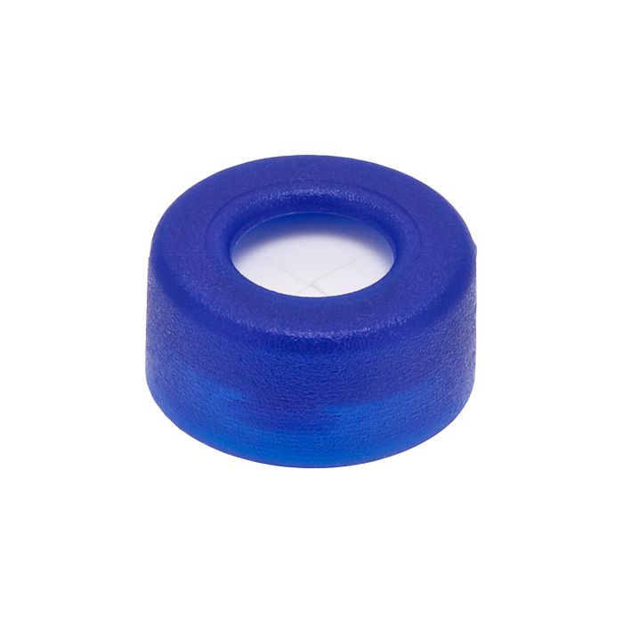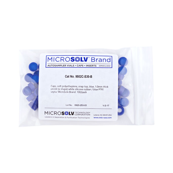 Caps, Snap Top, with 1.00mm thick, White Silicone Rubber / Blue PTFE Pre-Slit (X Shape) Septa, fitted in smooth, soft polyethylene, Blue Caps. For use with 11mm, 12x32mm Snap Top autosampler vials. MicroSolv Brand. 100/PK.