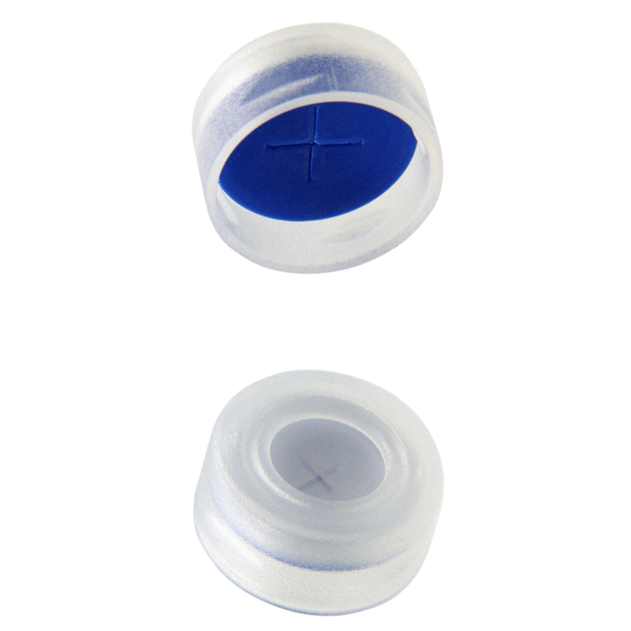 Caps, Snap Top, with 1.00mm thick, White Silicone Rubber / Blue PTFE Pre-Slit (X Shape) Septa, fitted in smooth, soft polyethylene, Natural Transparent Caps. For use with 11mm, 12x32mm Snap Top autosampler vials. MicroSolv Brand. 100/PK.