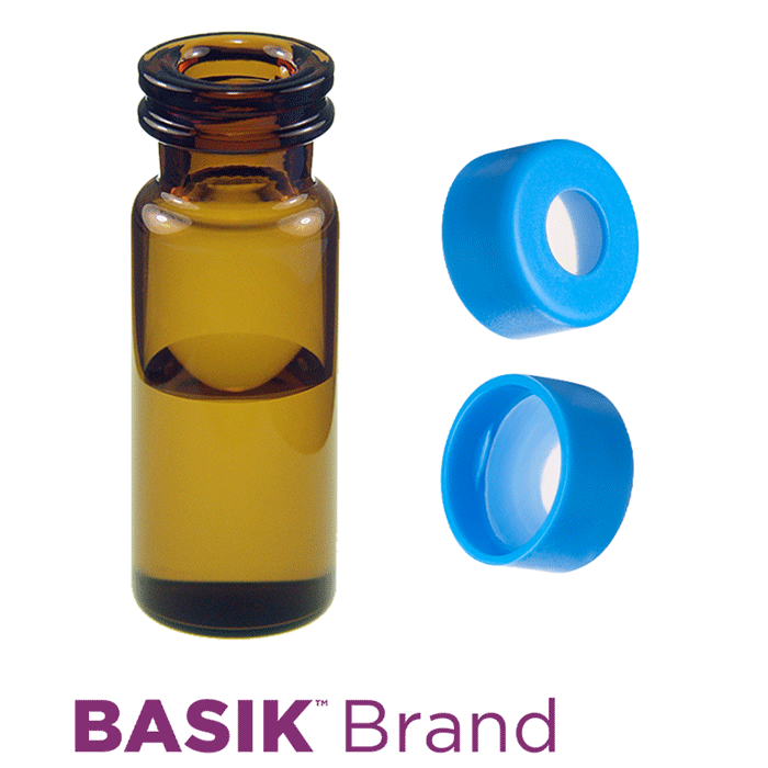 Vial & Cap Kit includes 100 EA 2ml, Snap Top, Amber Autosampler Vials and 100 EA matching Snap Caps with Silicone Rubber / PTFE, ultra-pure Septa, fitted in the Light Blue Caps. BASIK Brand Easy Purchase Pack. 1/PK.