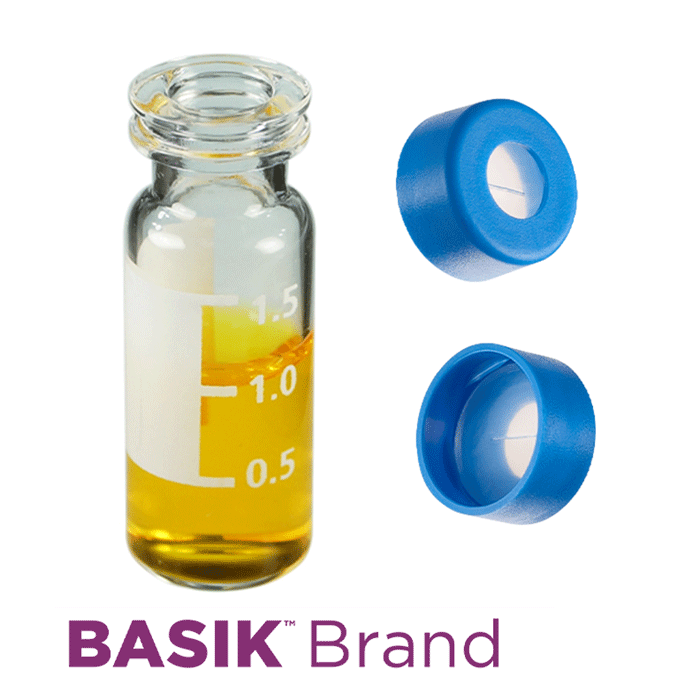 Vial & Cap Kit includes 100 EA 2ml, Snap Top, Clear Autosampler Vials with Write-On Patch and fill lines and 100 EA matching Snap Caps with Silicone Rubber / PTFE Pre-Slit, ultra-pure Septa, fitted in the Light Blue Caps. BASIK Brand Easy Purchase Pack. 1/PK.