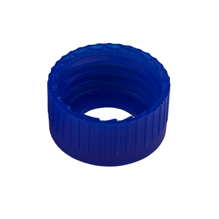 Caps, Screw Top, with an Open Hole. "Knurled", polypropylene, Blue Caps. Septa are sold separately and must be inserted manually. For use with 9-425mm thread, 12x32mm autosampler vials. MicroSolv Brand. 1,000/CS.