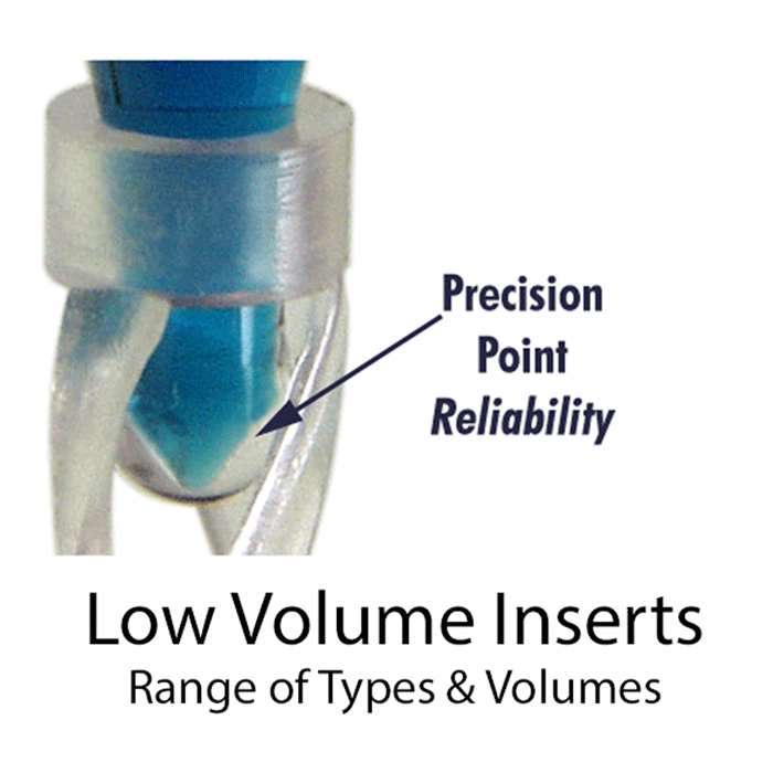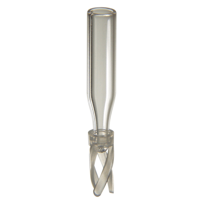 Inserts, Low Volume for Vials, Glass. Clear, 300ul fill volume with a conical, precision point and 6x29mm outer dimensions with plastic springs attached. For use in 2ml autosampler vials. AQ Brand. 100/PK.