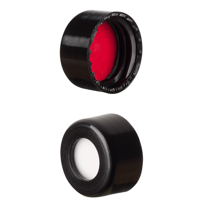 Caps, Screw Top, with Silicone Rubber / PTFE Septa, fitted in smooth sided, Robo Style, soft polypropylene, Black Caps. For use with 9-425mm thread, 12x32mm autosampler vials. BASIK Brand. 100/PK.