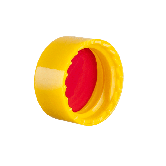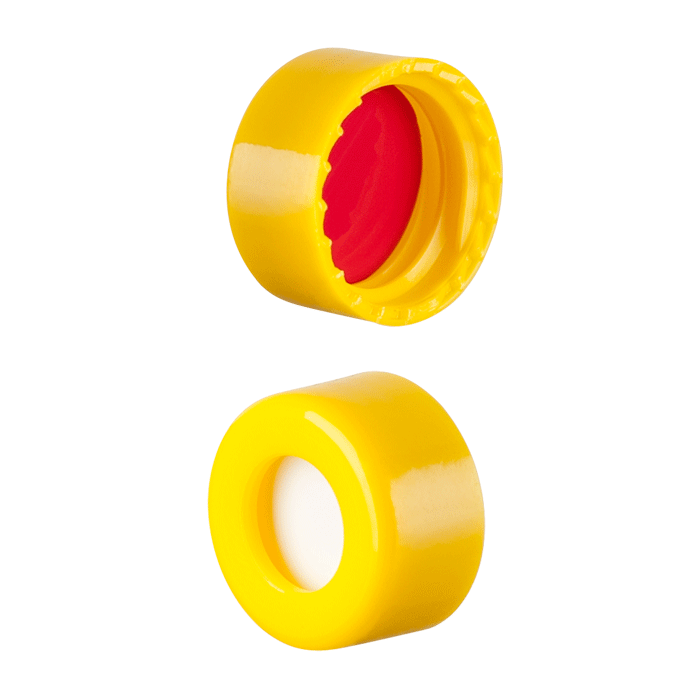 Caps, Screw Top, with Silicone Rubber / PTFE Septa, fitted in smooth sided, Robo Style, soft polypropylene, Yellow Caps. For use with 9-425mm thread, 12x32mm autosampler vials. BASIK Brand. 1000/CS.