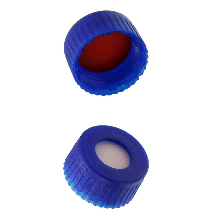 Caps, Screw Top, with Silicone Rubber / PTFE, low durometer Septa, bonded in "knurled", polypropylene, Blue Caps. For use with 9-425mm thread, 12x32mm autosampler vials. MicroSolv Brand. 1000/CS.