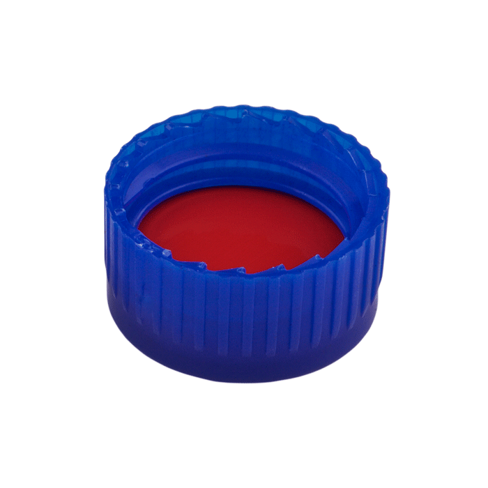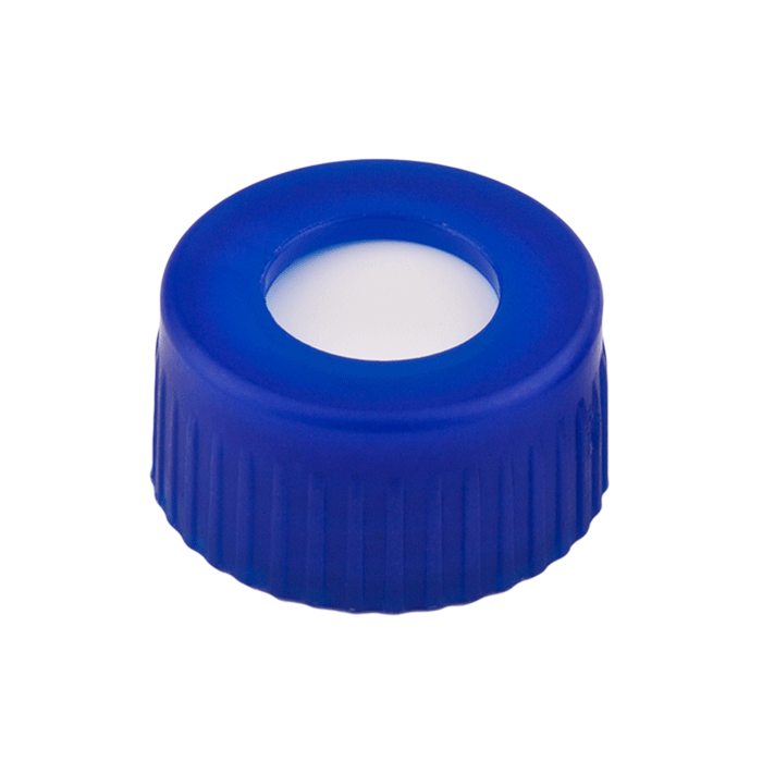 Caps, Screw Top, with Silicone Rubber / PTFE, low durometer Septa, fitted in "knurled", polypropylene, Blue Caps. For use with 9-425mm thread, 12x32mm autosampler vials. MicroSolv Brand. 1000/CS.