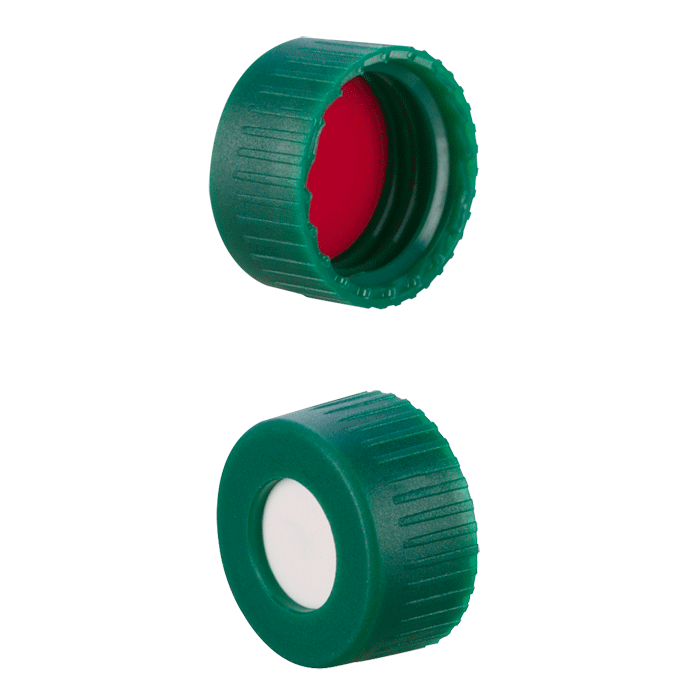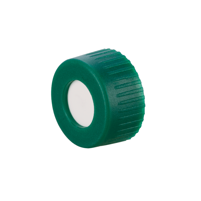 Caps, Screw Top, with Silicone Rubber / PTFE, low durometer Septa, bonded in "knurled", polypropylene, Green Caps. For use with 9-425mm thread, 12x32mm autosampler vials. MicroSolv Brand. 1000/CS.
